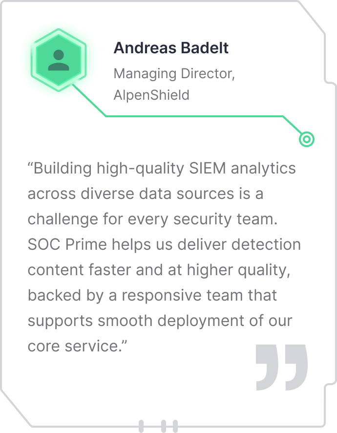 Using SOC Prime’s Threat Detection Marketplace, AlpenShield gains instant access to a broad library of high-quality, production-ready rules mapped to MITRE ATT&CK and enriched with detailed intelligence. This reduces time spent researching detection logic and maintaining analytics, which drives broader visibility and scalable services for a growing customer base.